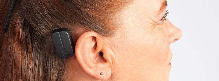 É composto de um pino de titânio implantado cirurgicamente no osso do crânio e uma prótese vibratória.