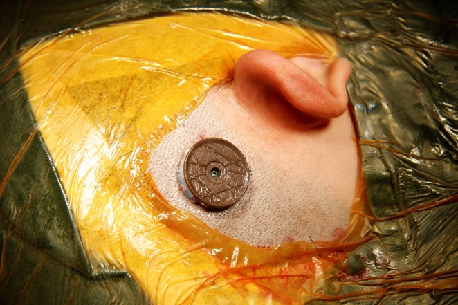 Em seguida, perfura-se o osso do crânio e fixa num sistema de rosca e pino um implante de titânio. Este implante irá com o tempo se osteointegrar no osso, incorporando-se e fixando-se firmente ao osso permanentemente.