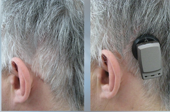 É composto de um pino de titânio implantado cirurgicamente no osso do crânio e uma prótese vibratória.
