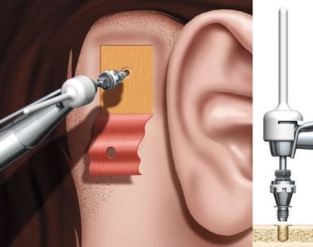 Em seguida, perfura-se o osso do crânio e fixa num sistema de rosca e pino um implante de titânio. Este implante irá com o tempo se osteointegrar no osso, incorporando-se e fixando-se firmente ao osso permanentemente.