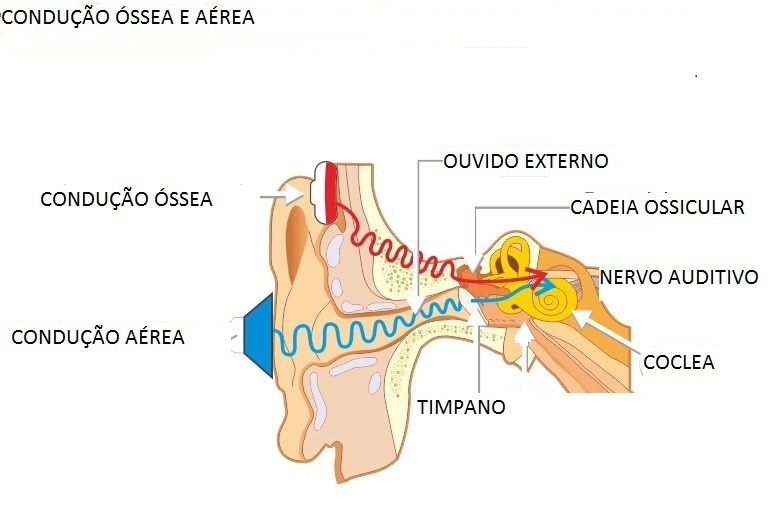 Existem duas formas que o som pode estimular o nosso ouvido (ou orelha) interno. Nós chamamos de estimulação por via aérea e por via óssea. Na figura abaixo podemos ver a diferença.